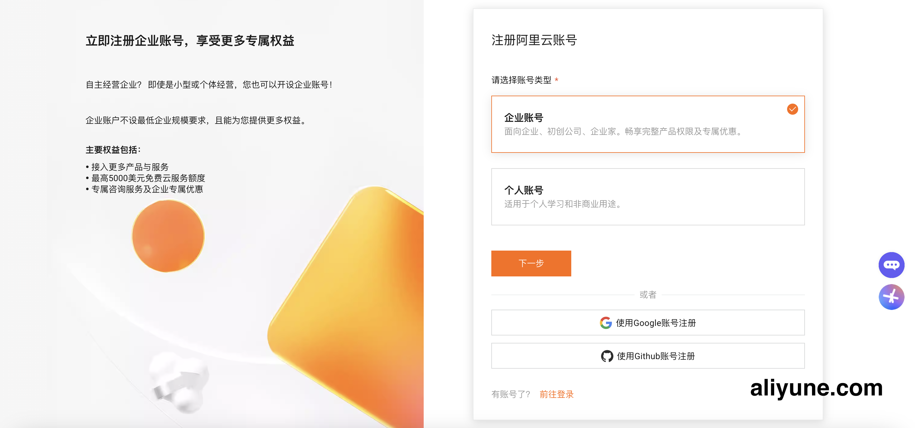 | 1. 选择账号类型 | 注册阿里云国际账号时,可选择 个人账号(Individual)或 企业账号(Enterprise)。 |